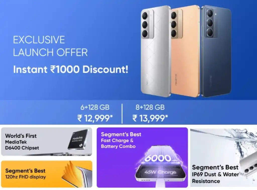 Realme P3x 5G 27% discount latest offer- Realme ने अपने नए स्मार्टफोन Realme P3x 5G के साथ मिड-रेंज सेगमेंट में एक बेहद ताकतवर डिवाइस पेश किया है। इस फोन पर अभी 27% का प्रभावी डिस्काउंट चल रहा है, जिससे इसकी कीमत इसके ग्रुप रेंज ₹8,750 से ₹12,500 के बीच और भी आकर्षक लगती है। यह ऑफर सीमित अवधि के लिए है, और टेक प्रेमियों के बीच तेजी से लोकप्रिय हो रहा है।http://7000mAh बैटरी और Dimensity 6300 प्रोसेसर के साथ Oppo फ़ोन, देखें फीचर्स.