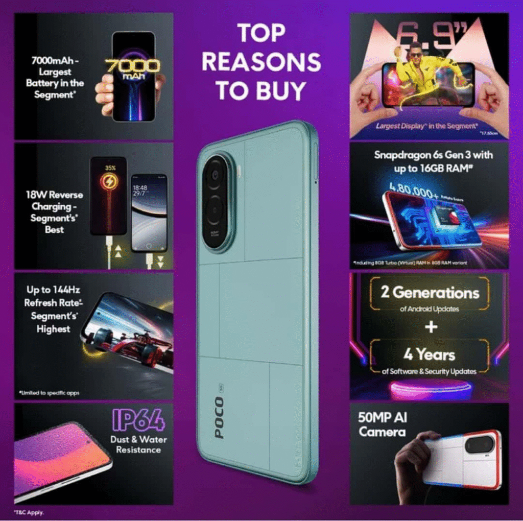 आज के दौर में बैटरी परफॉर्मेंस सबसे बड़ी जरूरत है और Poco ने इस पर ध्यान देते हुए इस डिवाइस में 7000mAh की बड़ी बैटरी दी है। यह बैटरी 33W फास्ट चार्जिंग को सपोर्ट करती है, जो कम समय में ज्यादा पावर देती है। इसके अलावा, इसमें 18W रिवर्स चार्जिंग फीचर भी मौजूद है, जिससे यह फोन अन्य डिवाइस को भी चार्ज कर सकता है। यह फीचर विशेष रूप से ट्रैवलर्स और पॉवर यूज़र्स के लिए उपयोगी साबित हो सकता है।