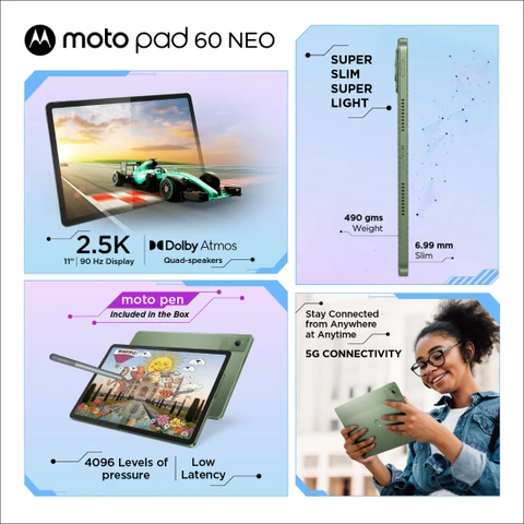 Motorola ने अपने आकर्षक और बजट-फ्रेंडली डिवाइस की सूची में एक और नाम जोड़ा है — Moto Pad 60 Neo। यह टैबलेट उन यूज़र्स के लिए खास है जो बड़े स्क्रीन साइज, दमदार बैटरी और 5G सपोर्ट के साथ एक ऑल-राउंडर डिवाइस की तलाश में हैं। वर्तमान में इसकी कीमत लगभग ₹17,999 से शुरू होकर ₹22,499 तक जाती है, और यह कई ऑनलाइन प्लेटफॉर्म पर ₹1,000–₹1,500 तक का डिस्काउंट ऑफर कर रहा है